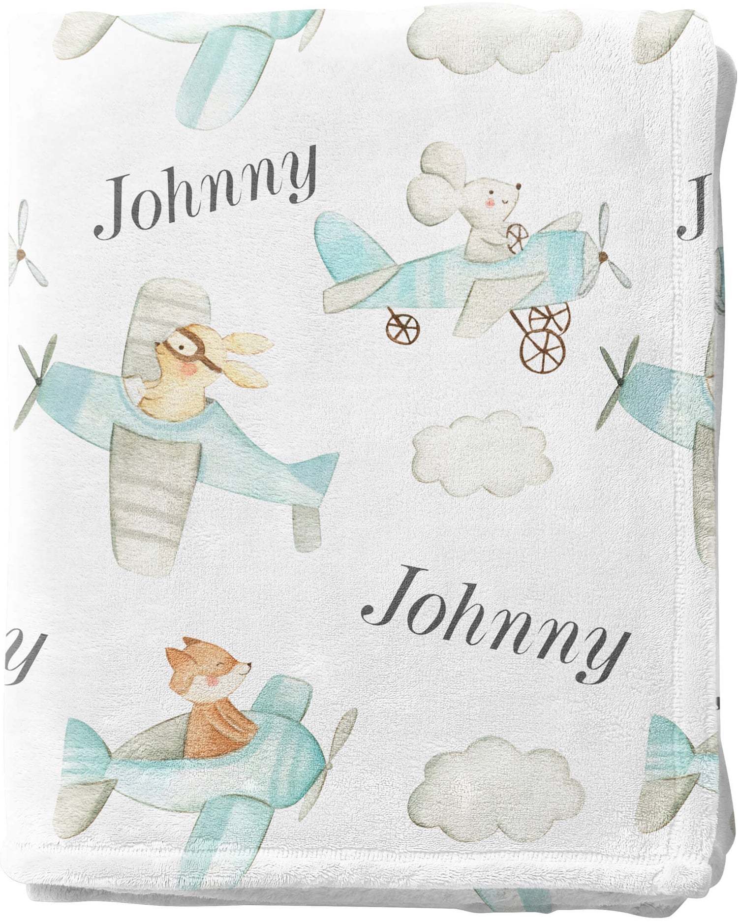 This unique custom baby name blanket is the perfect addition to any nursery. Featuring adorable imagery of blue and gray airplanes and beige animals (mice, rabbits, and foxes) printed over a soft, white background, this blanket is sure to be cherished for years to come. The personalization option allows you to have your favorite name printed on the blanket. This charming blanket is perfect for both boys and girls and will become a cherished family heirloom. The cozy fleece fabric is soft and durable. This blanket makes a perfect gift for any new parent or baby.